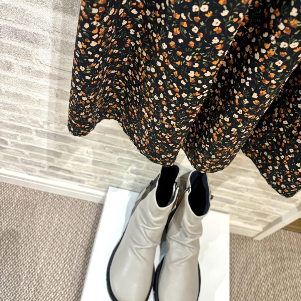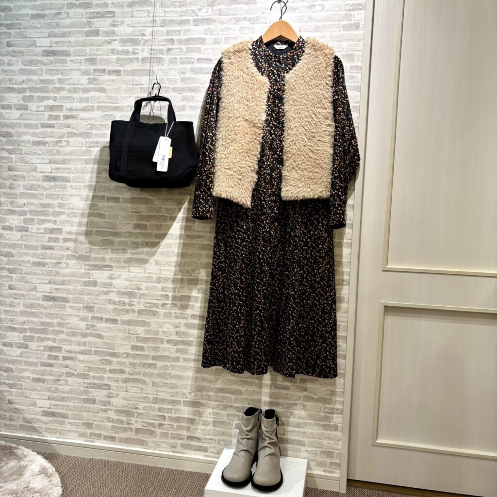 甘すぎないシックな色合いの小花柄ワンピースコーデ