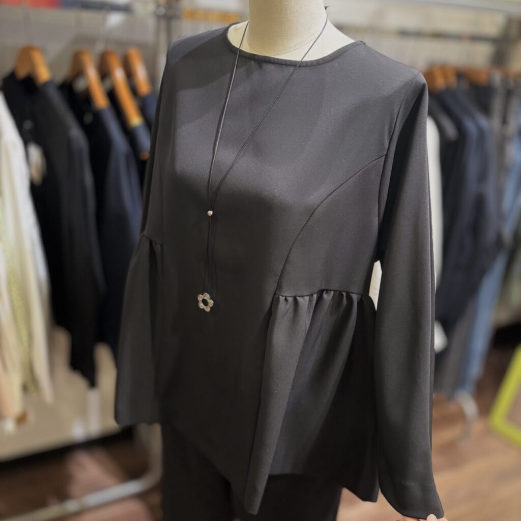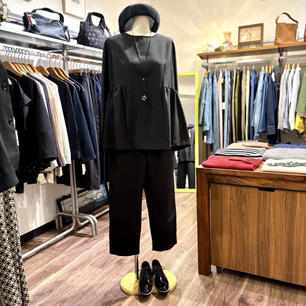 セレモニースタイル ✴︎ 1 2026.02.02 アイテム紹介 2026.02.02 KELEN より いろんなイベントやセレモニーに活躍する ブラックのセットアップ トップス 16,940円 パンツ 16,940円 エナメルシューズ 12,100円 トップスはギャザーがアクセントのふんわりタイプ パンツスタイルなので、いろんな場面で出番が多そうなセットアップですよー(^^)/ ニットBAG 本日のディスプレー 関連記事 チェック*ジャンスカ ドット柄ワンピース ボーダー×無地 カラフル*ワンピース