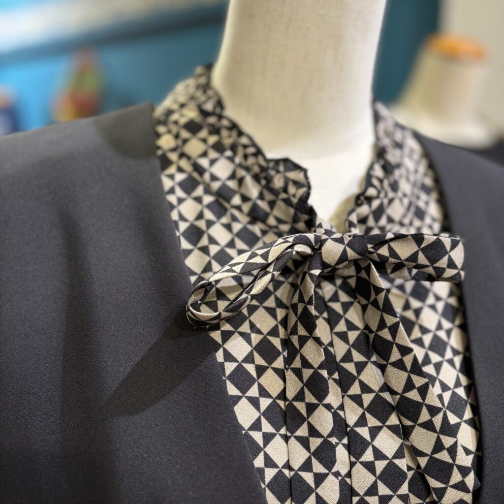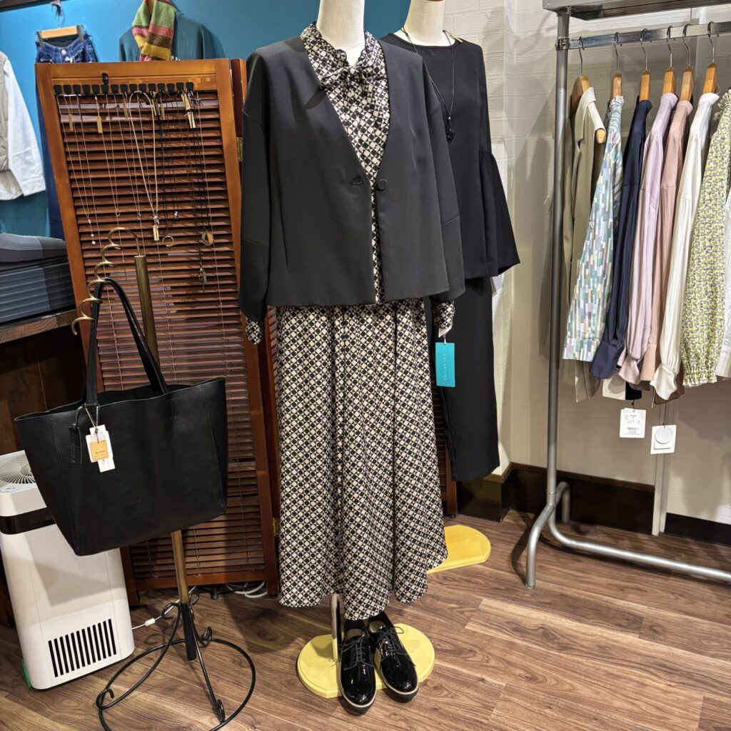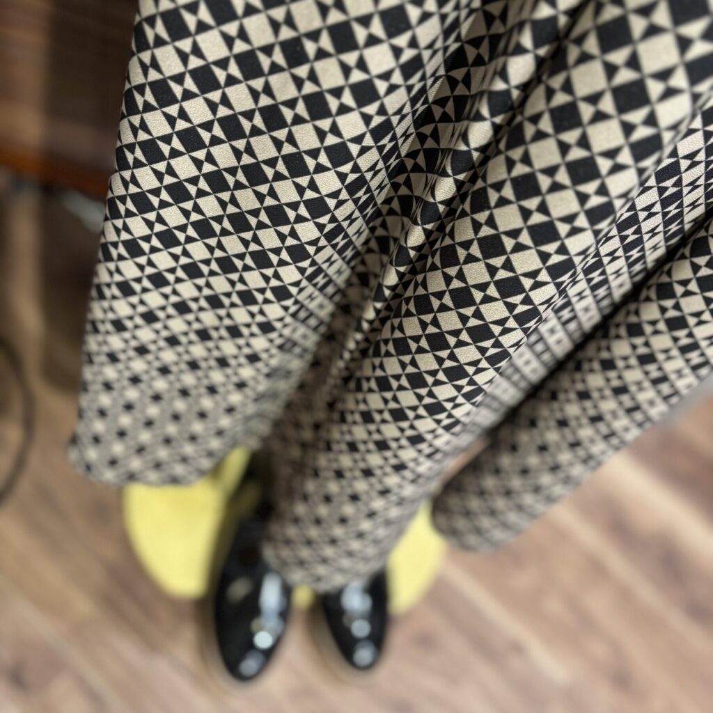 幾何学柄がレトロな雰囲気のブラウス&スカート